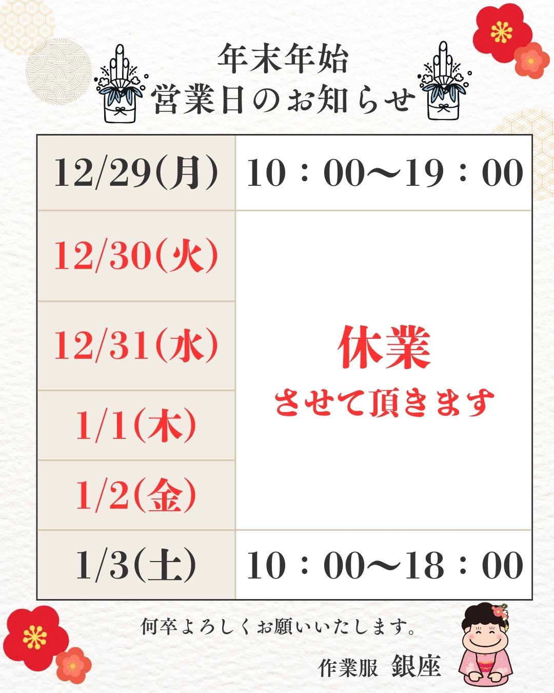 🎍年末年始営業日のお知らせ🎍 2025.12.23 カテゴリ: お知らせ いつも作業服の銀座をご利用いただきありがとうございます。 銀座全店の年末年始営業日のお知らせです。 何卒ご理解いただきますようお願い申し上げます。 初売りは1月3日土曜日10時からです。 新年も皆様のご来店を心よりお待ちしております。 良い年をお迎えくださいませ。